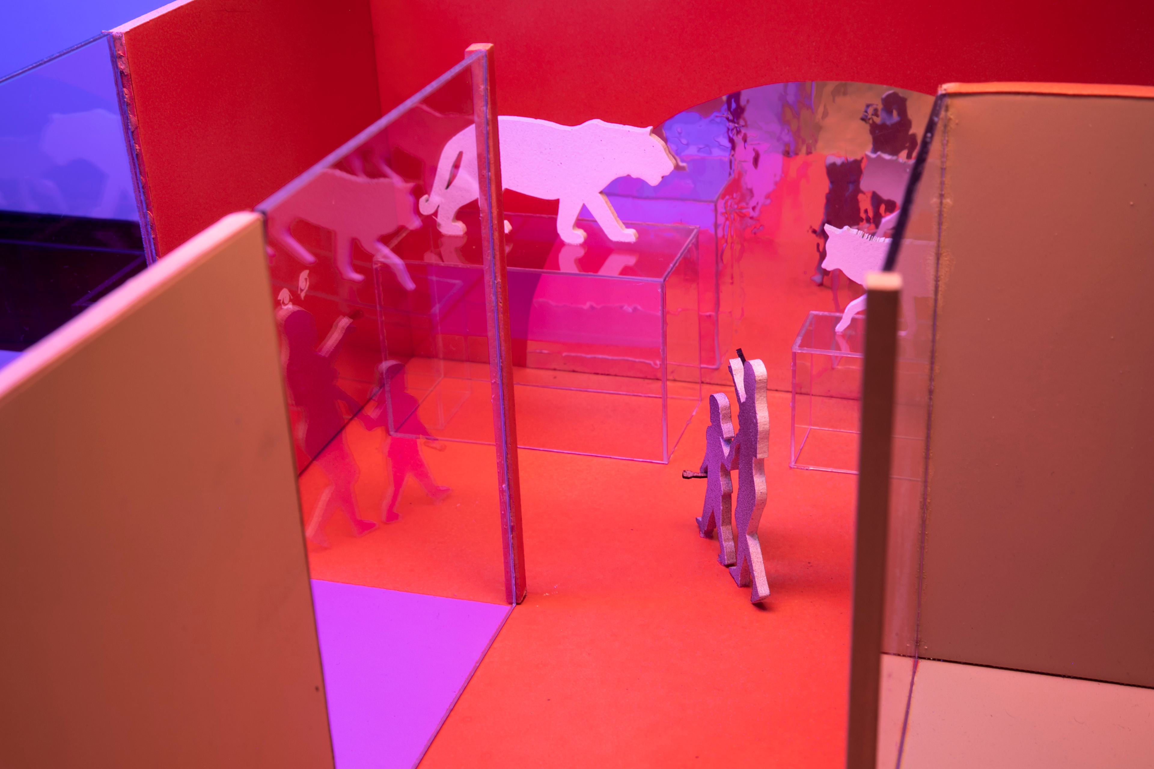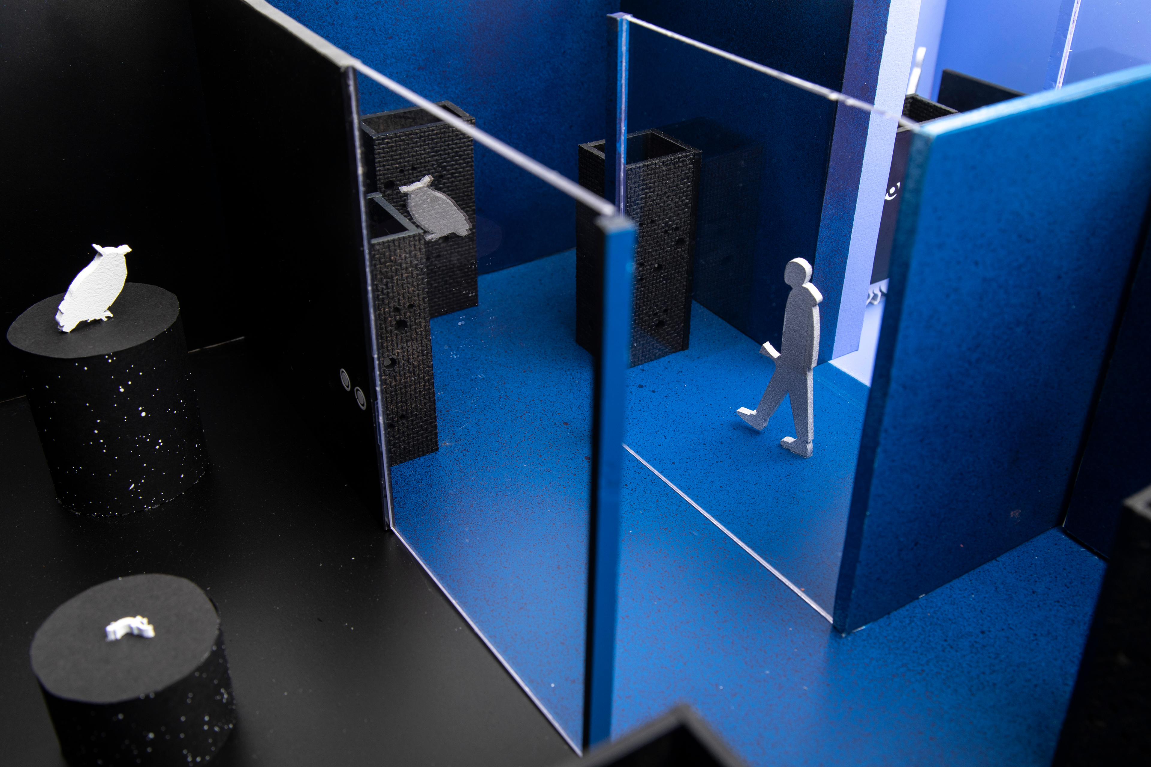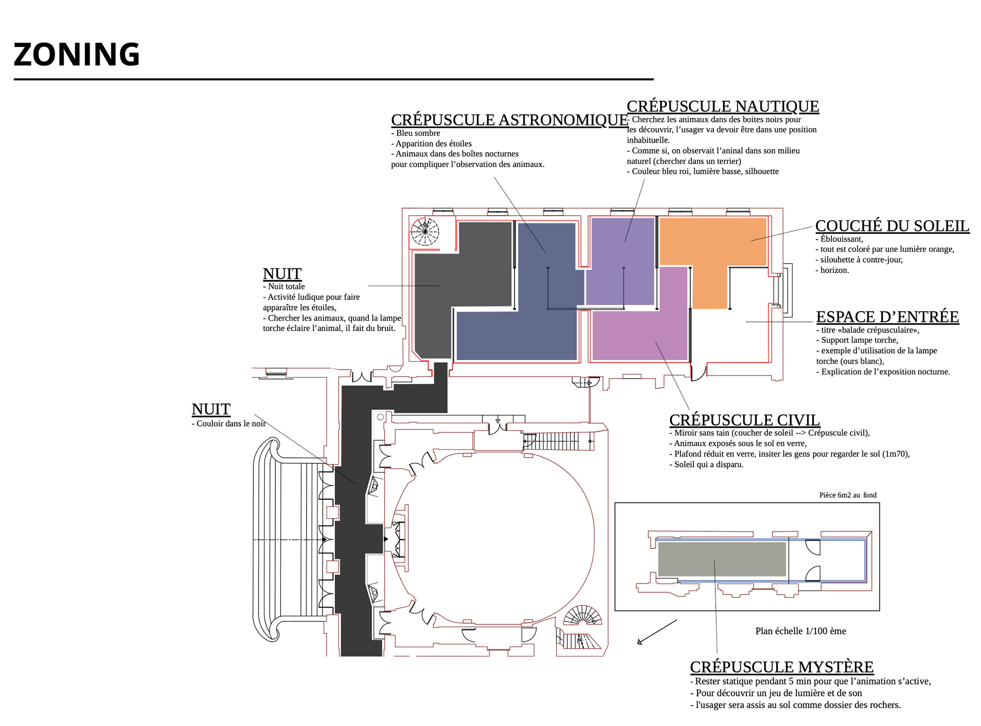 Pour cette exposition, j’ai choisi de plonger les visiteurs dans une narration crépusculaire, retraçant les différentes phases de la tombée de la nuit accompagné de la faune qui s’y éveille.