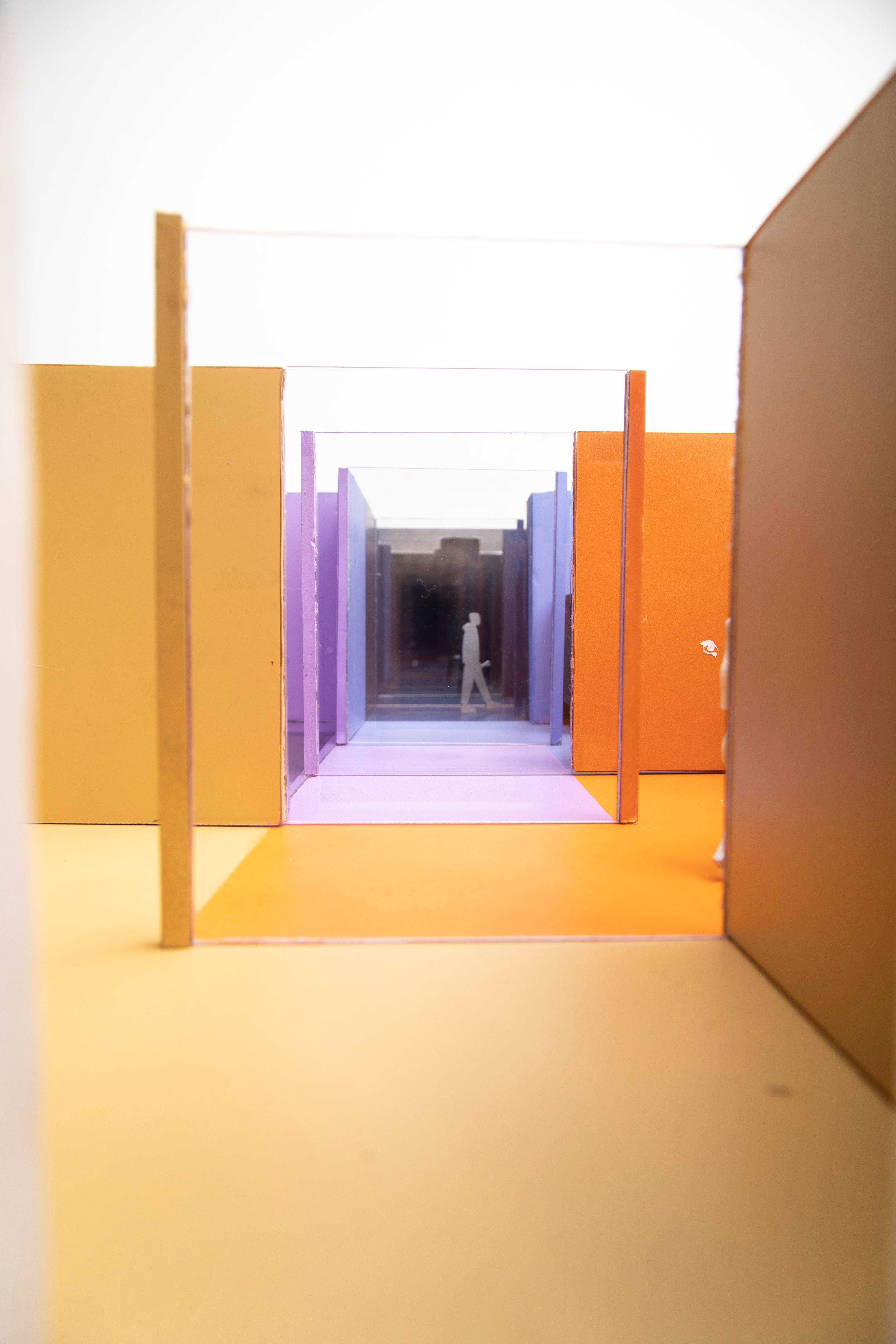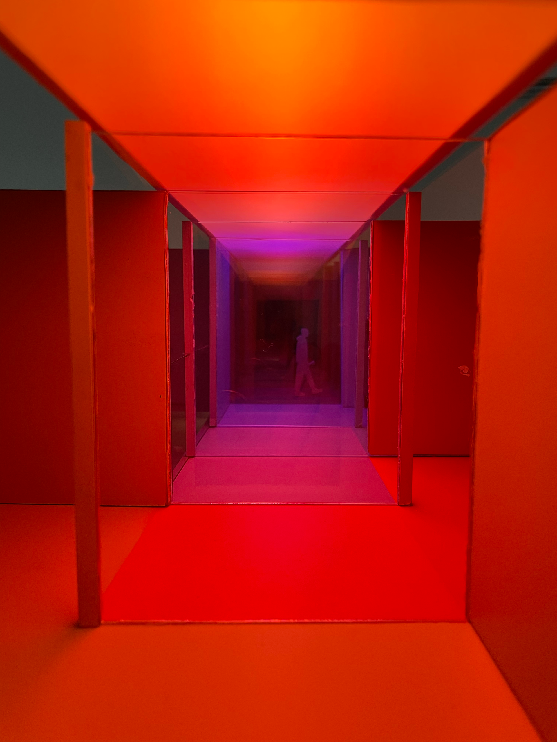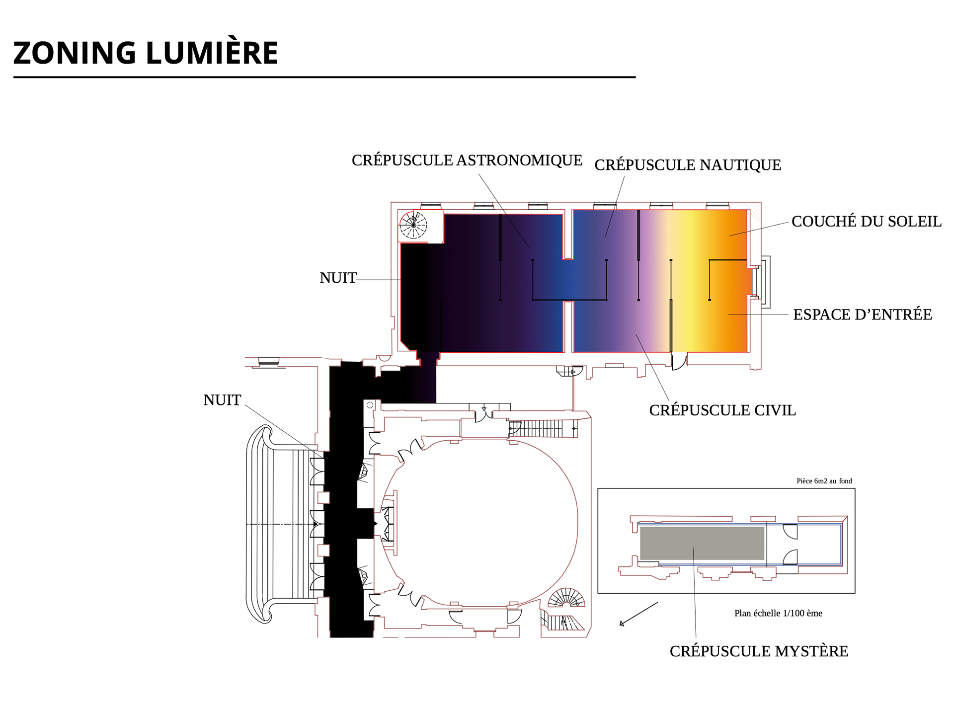 L’expérience se déploie en cinq cycles lumineux à parcourir, du coucher de soleil à la nuit noire, matérialisés par la couleur des murs, une ambiance sonore et un éclairage évolutif au plafond pour renforcer l’immersion. Un couloir vitré central permet d’observer la progression des teintes ainsi que les gens qui les traversent.