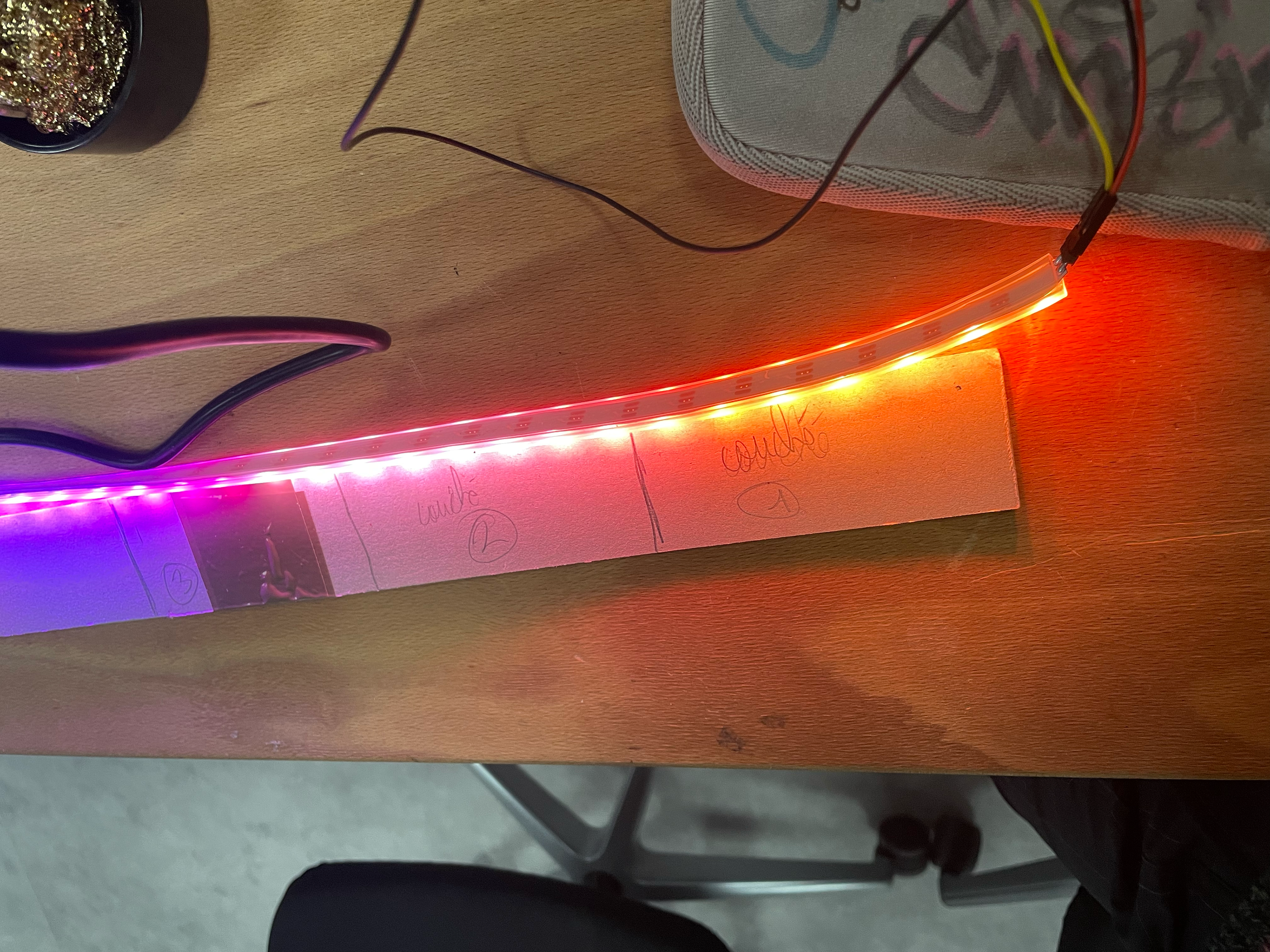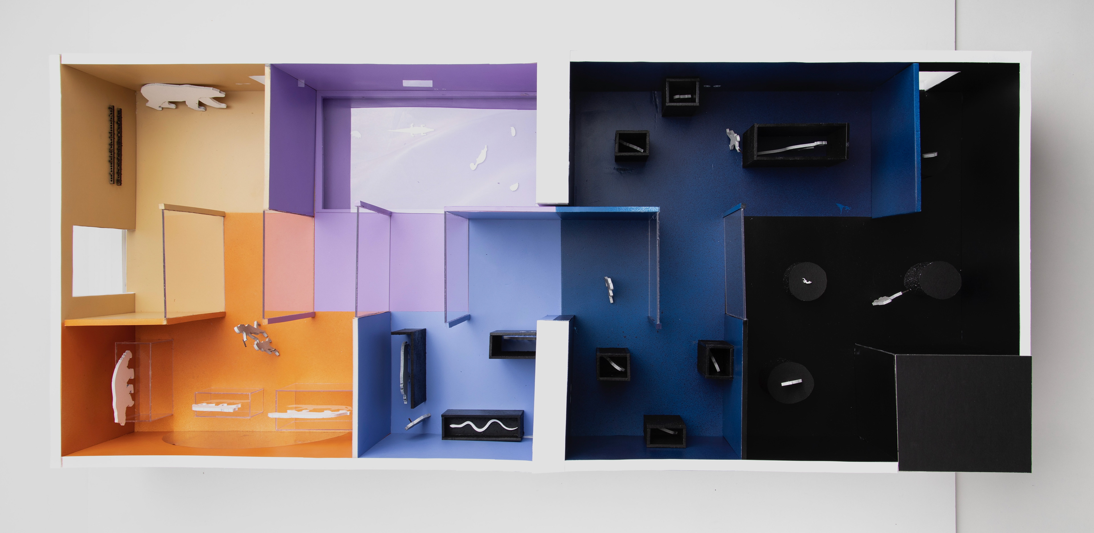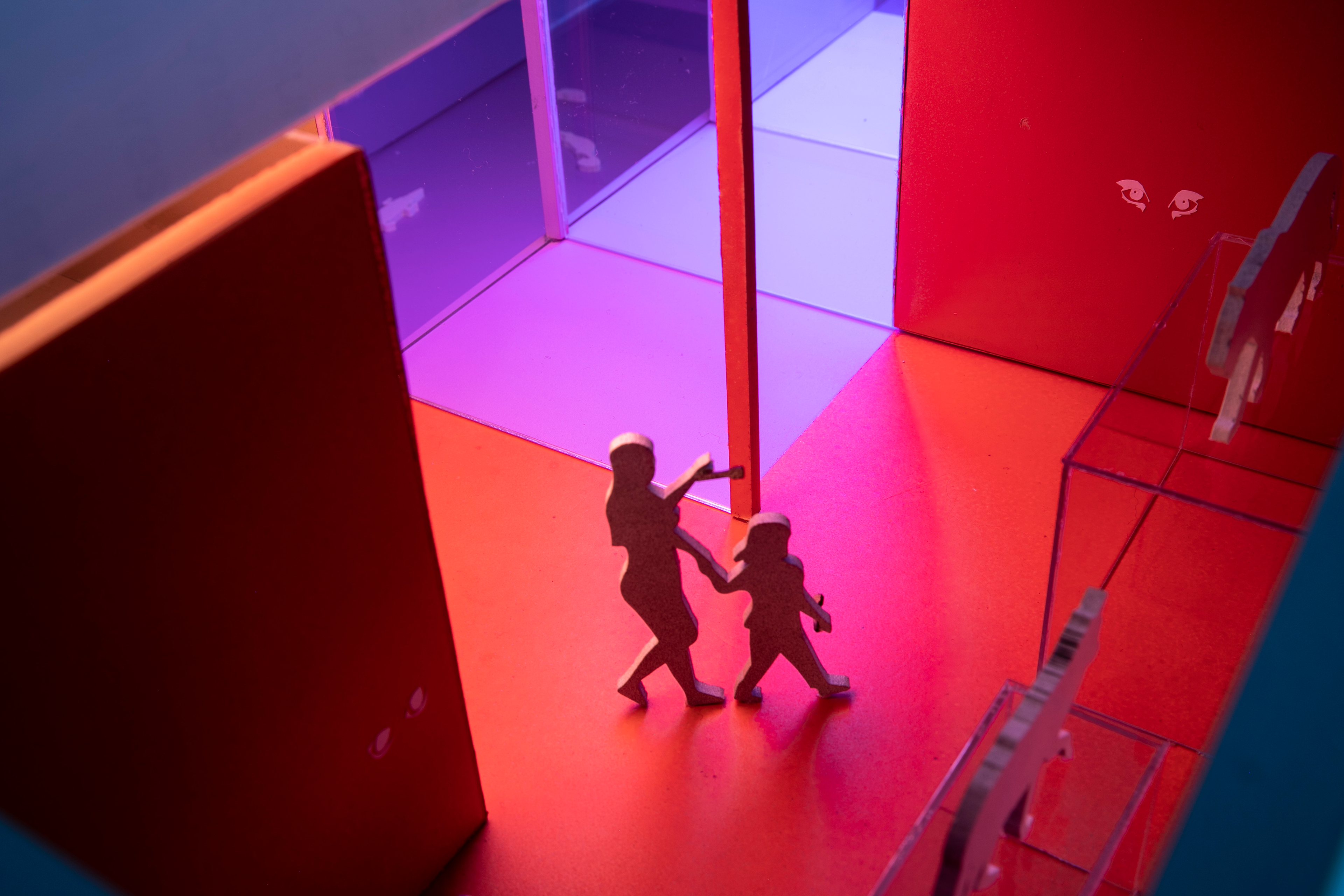 L’expérience se déploie en cinq cycles lumineux à parcourir, du coucher de soleil à la nuit noire, matérialisés par la couleur des murs, une ambiance sonore et un éclairage évolutif au plafond pour renforcer l’immersion. Un couloir vitré central permet d’observer la progression des teintes ainsi que les gens qui les traversent.