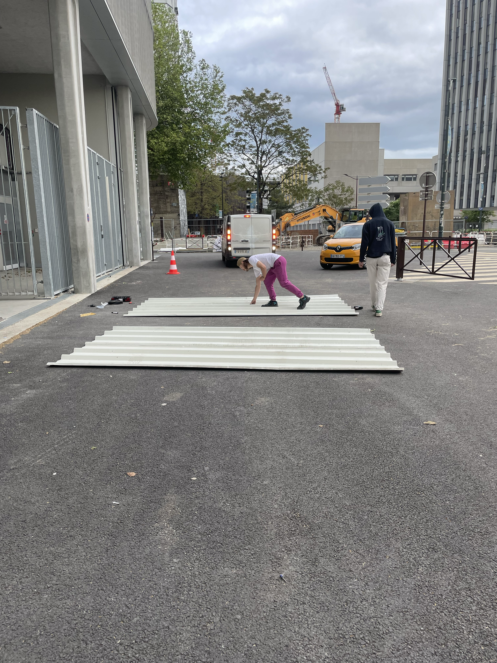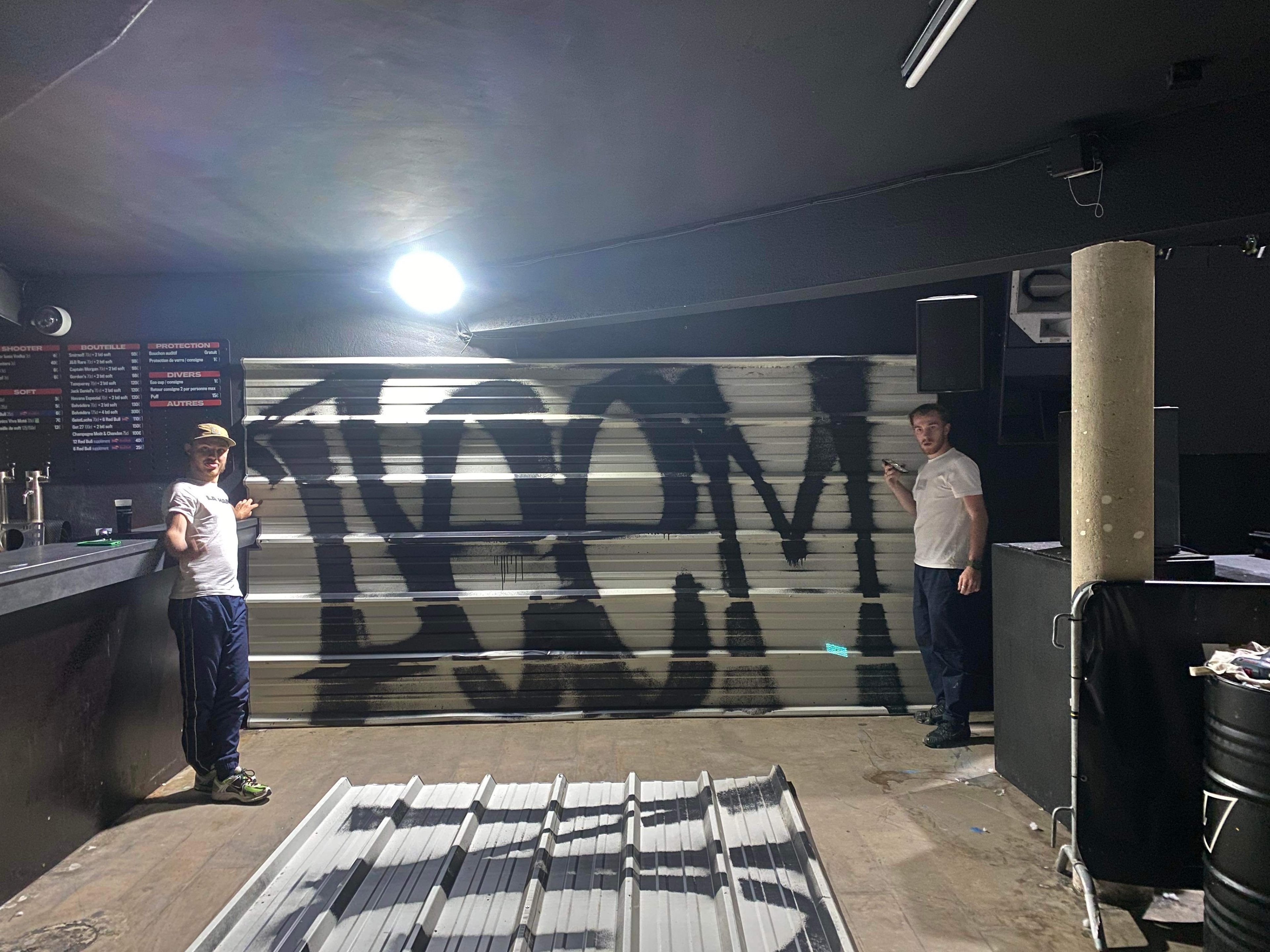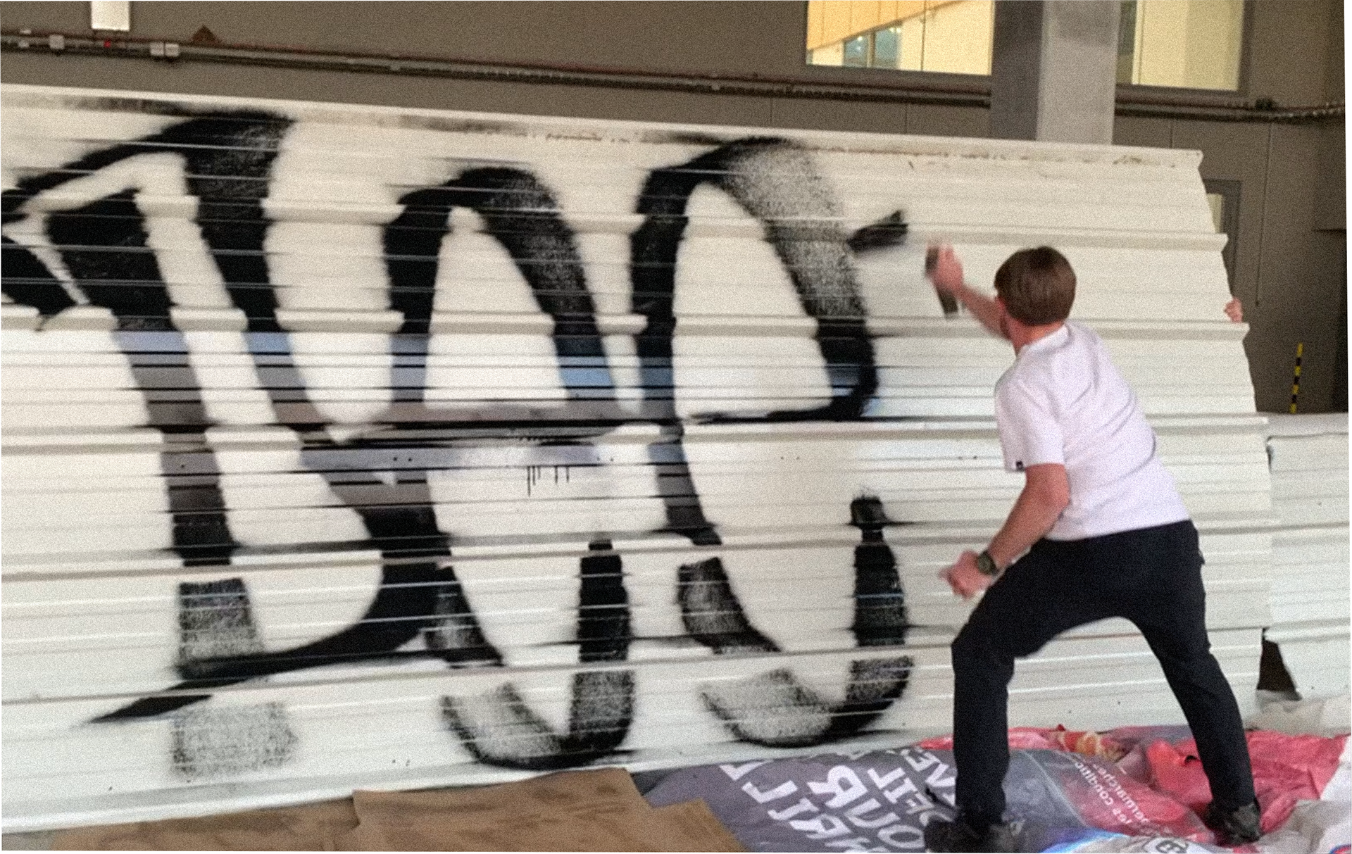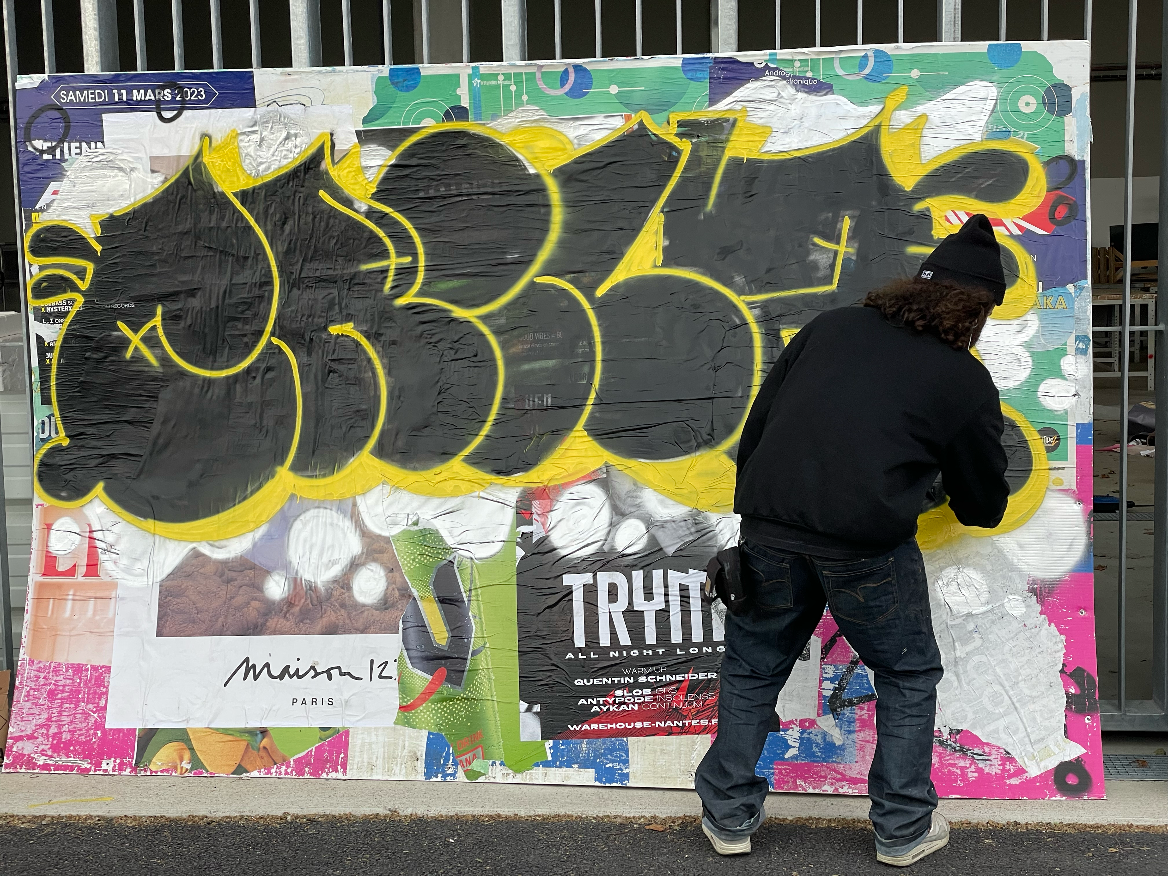 - Collaboration avec une quinzaine de graffeur pour recouvrir des panneaux pvc (récupérés) avec leur blaze. Code couleur : chrome, jaune, noir.