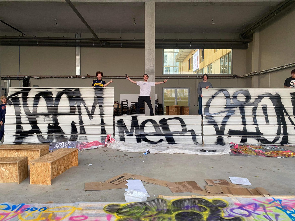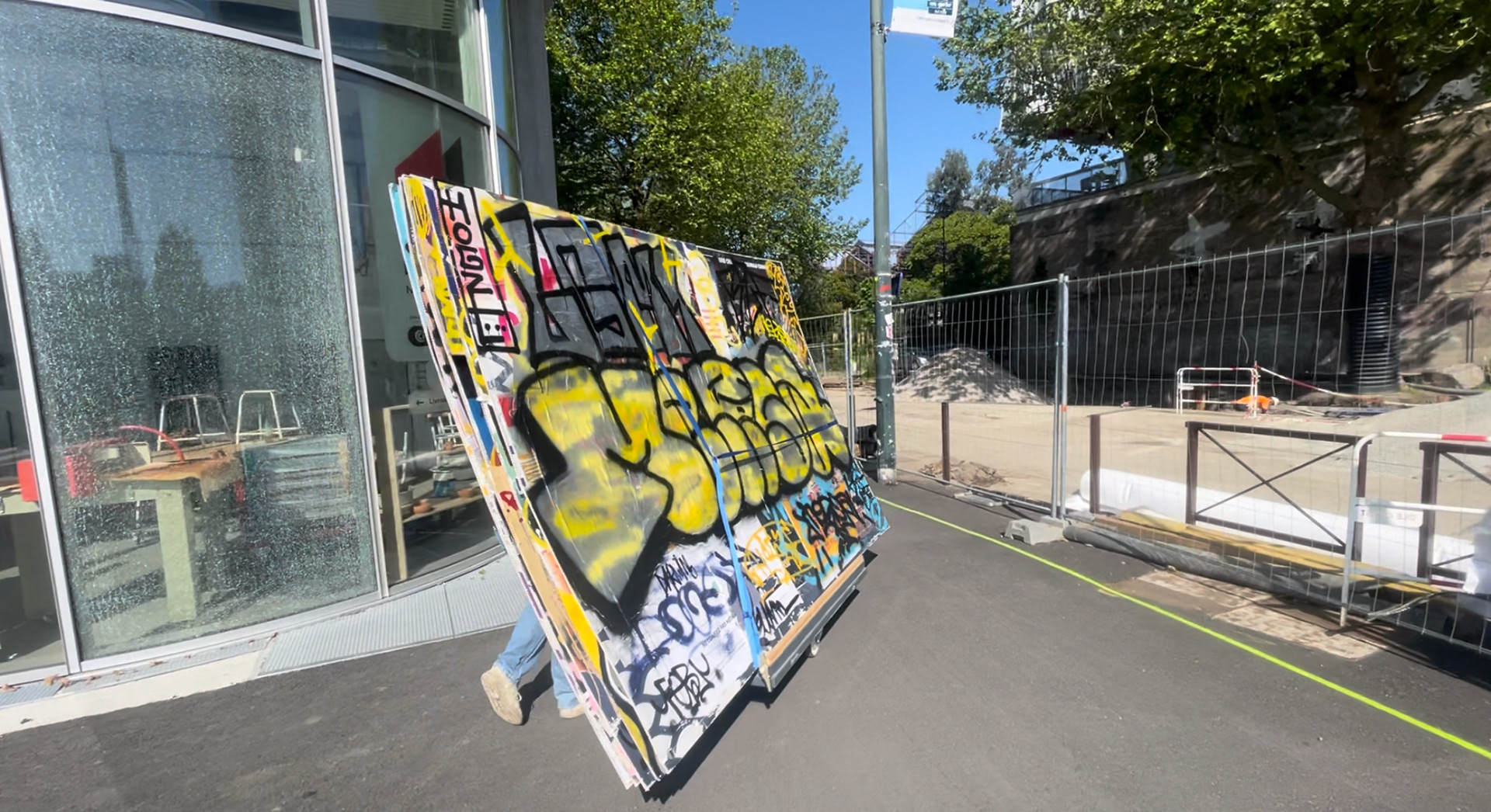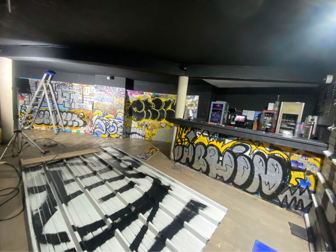 - Collaboration avec une quinzaine de graffeur pour recouvrir des panneaux pvc (récupérés) avec leur blaze. Code couleur : chrome, jaune, noir.