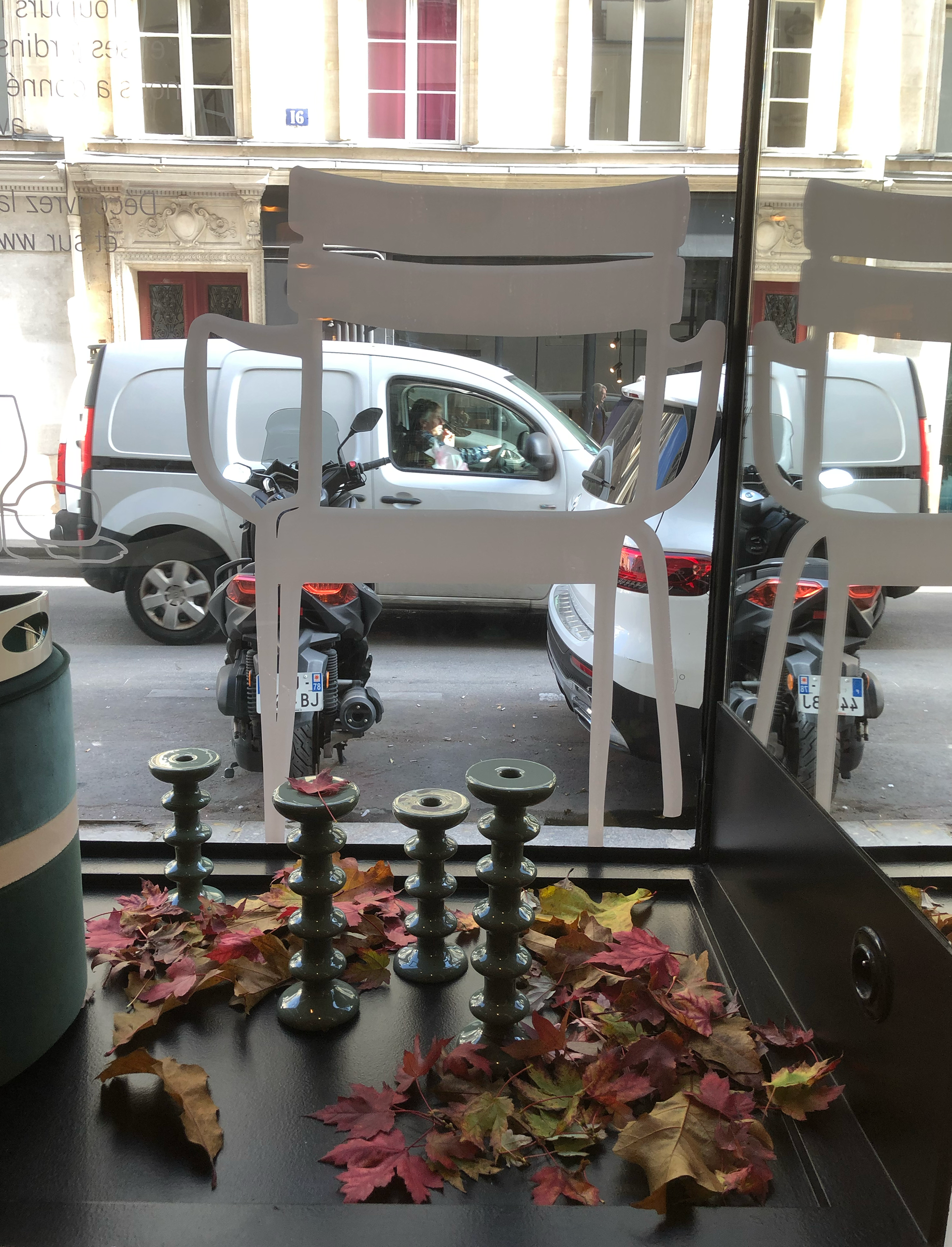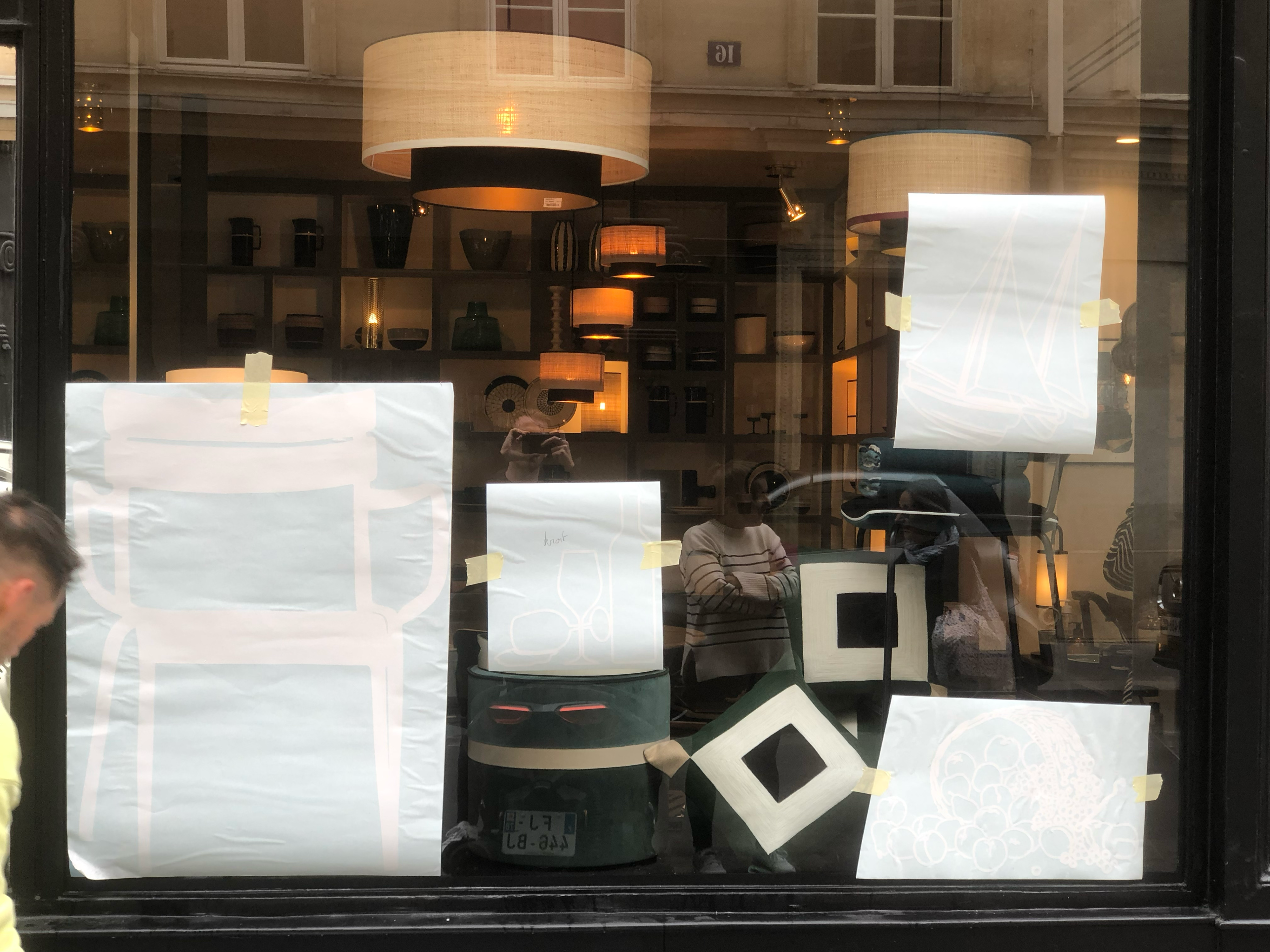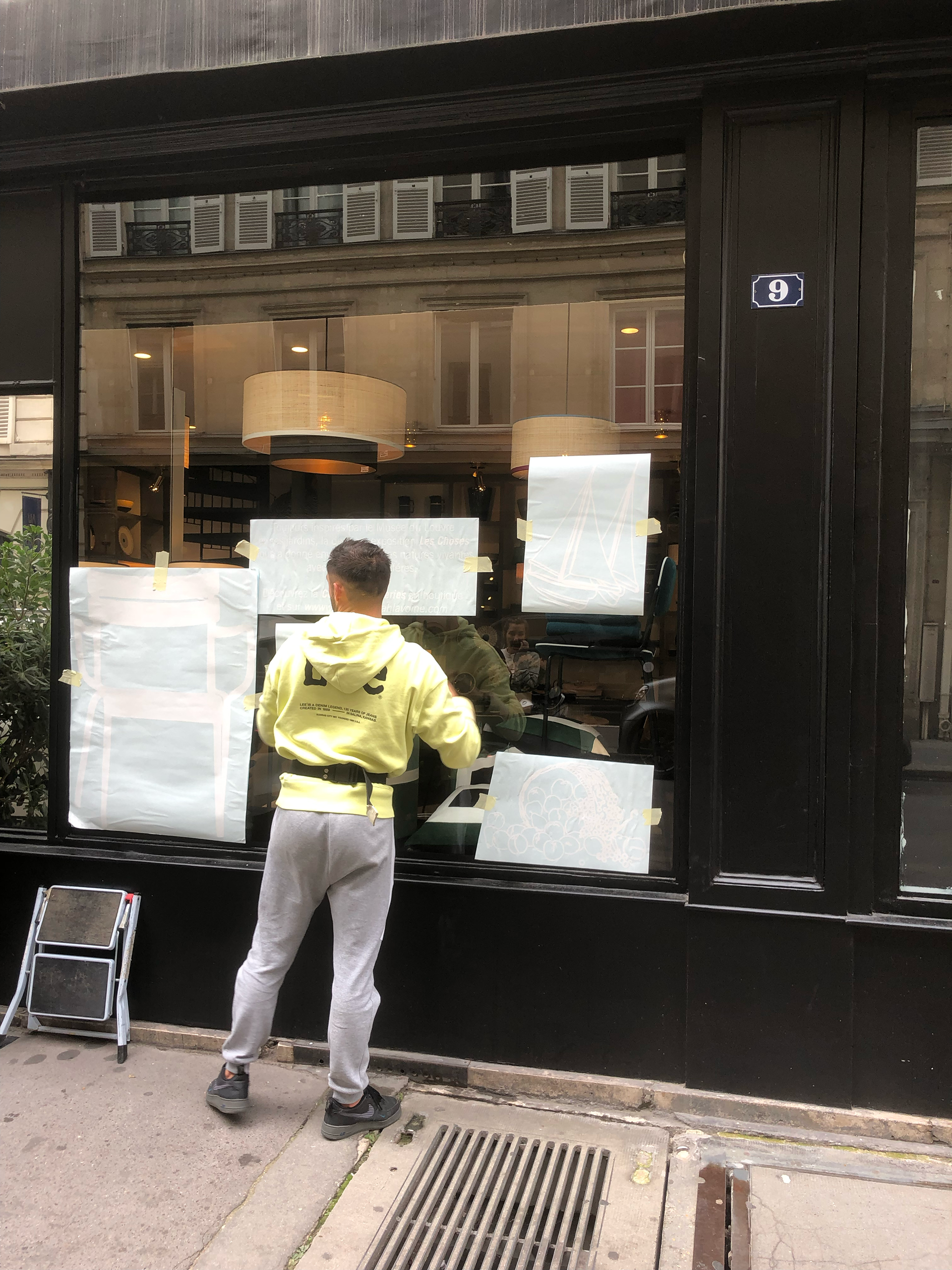 Mon concept est une vitrophanie, jouant sur le premier et second plan pour brouiller la frontière entre 2D et 3D, et transformer la vitrine en une véritable nature morte.