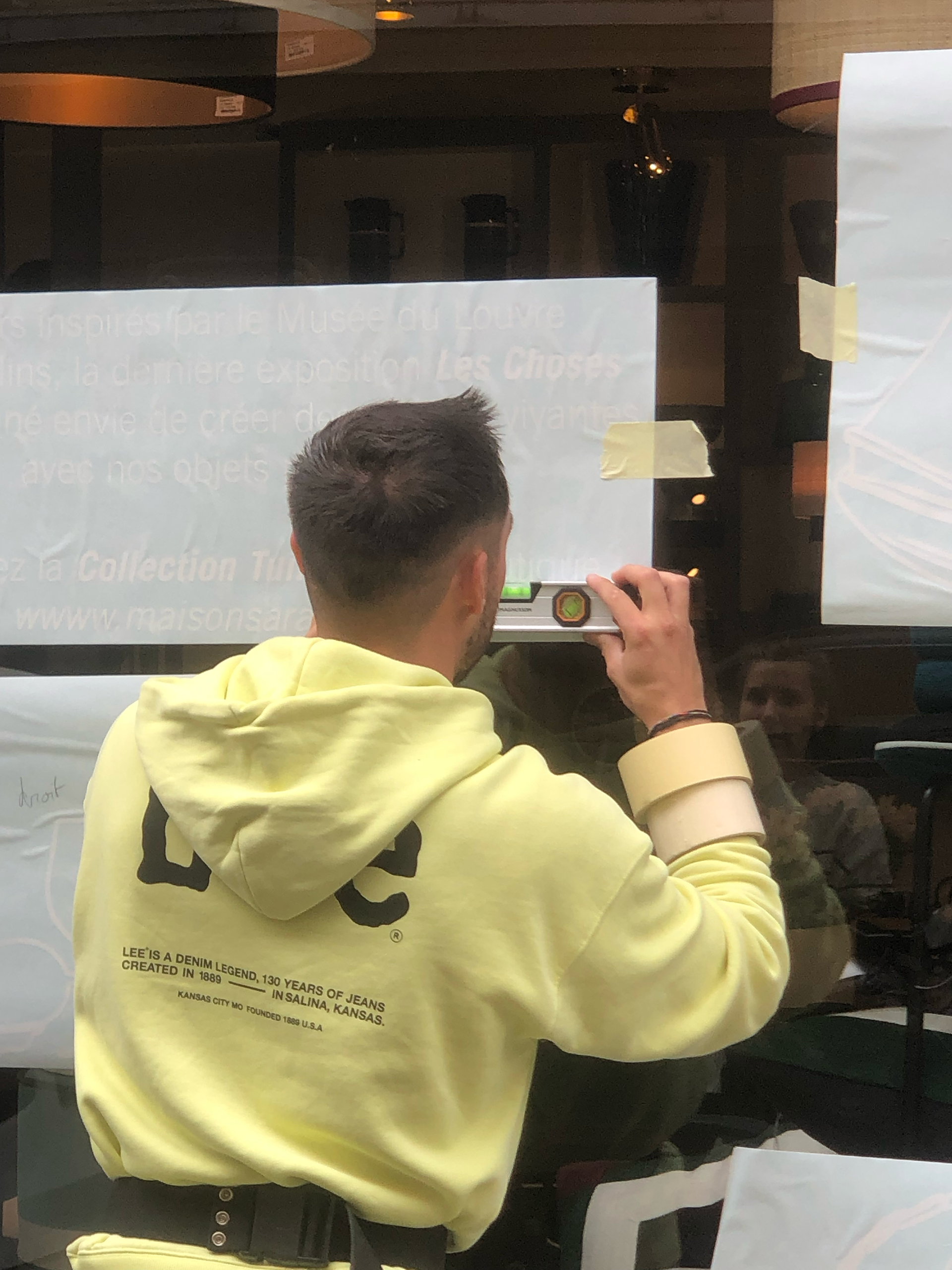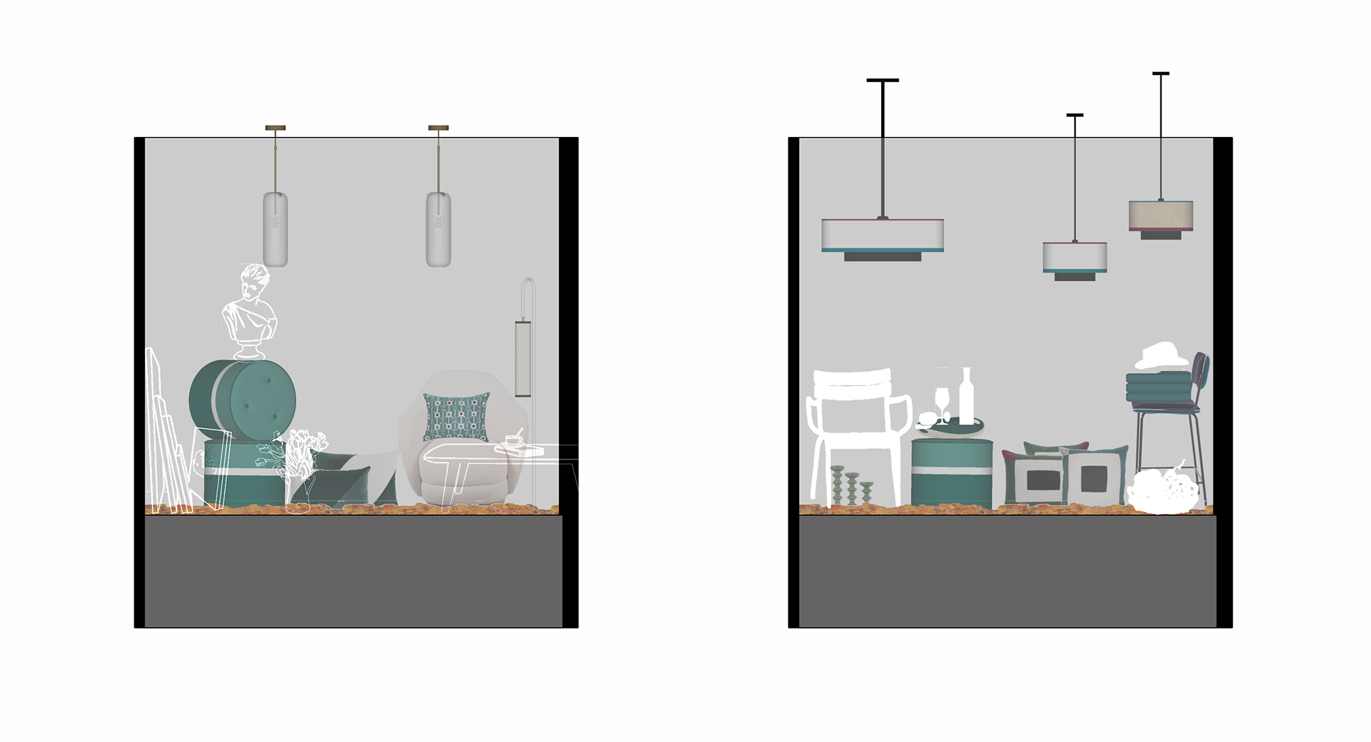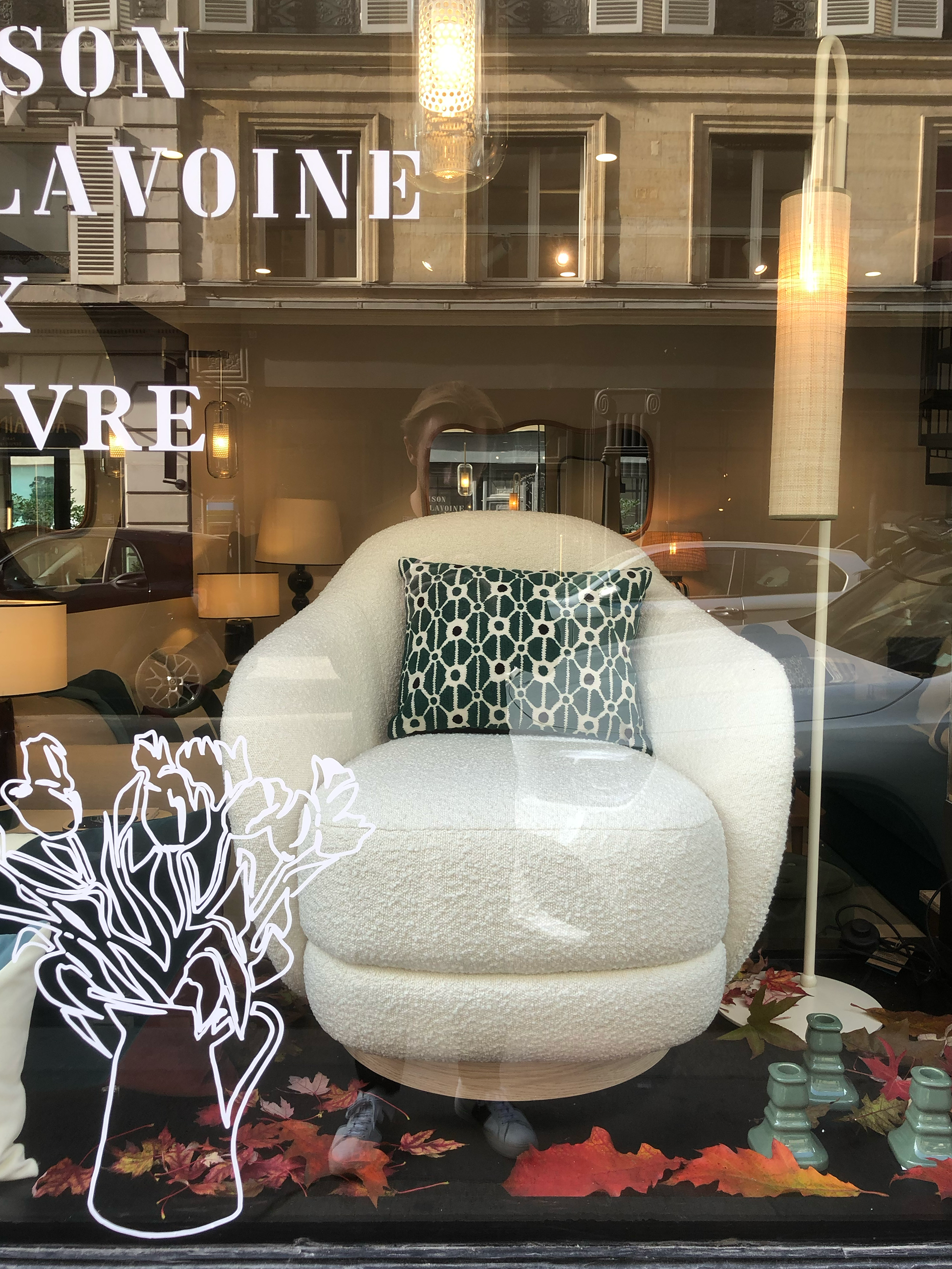 Mon concept est une vitrophanie, jouant sur le premier et second plan pour brouiller la frontière entre 2D et 3D, et transformer la vitrine en une véritable nature morte.
